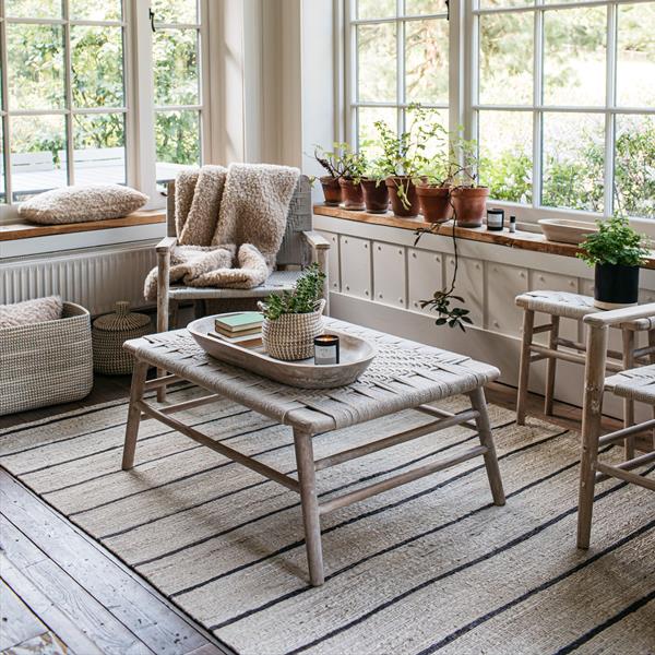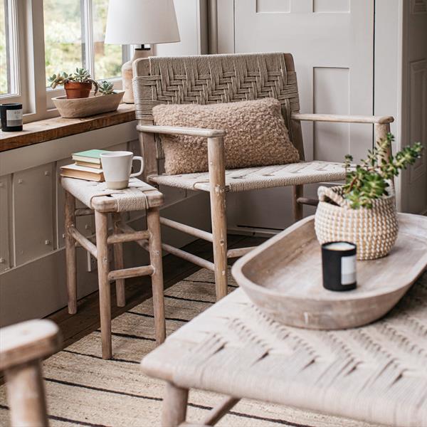 With a robust and refined wooden frame, this stool promises long-lasting service without demanding much from you - a simple wipe with a soft cloth will keep it looking new. The rope parts demand your gentleness by just needing a light vacuum on a low setting. Spot clean when necessary, and it will continue to serve by your favourite chair.